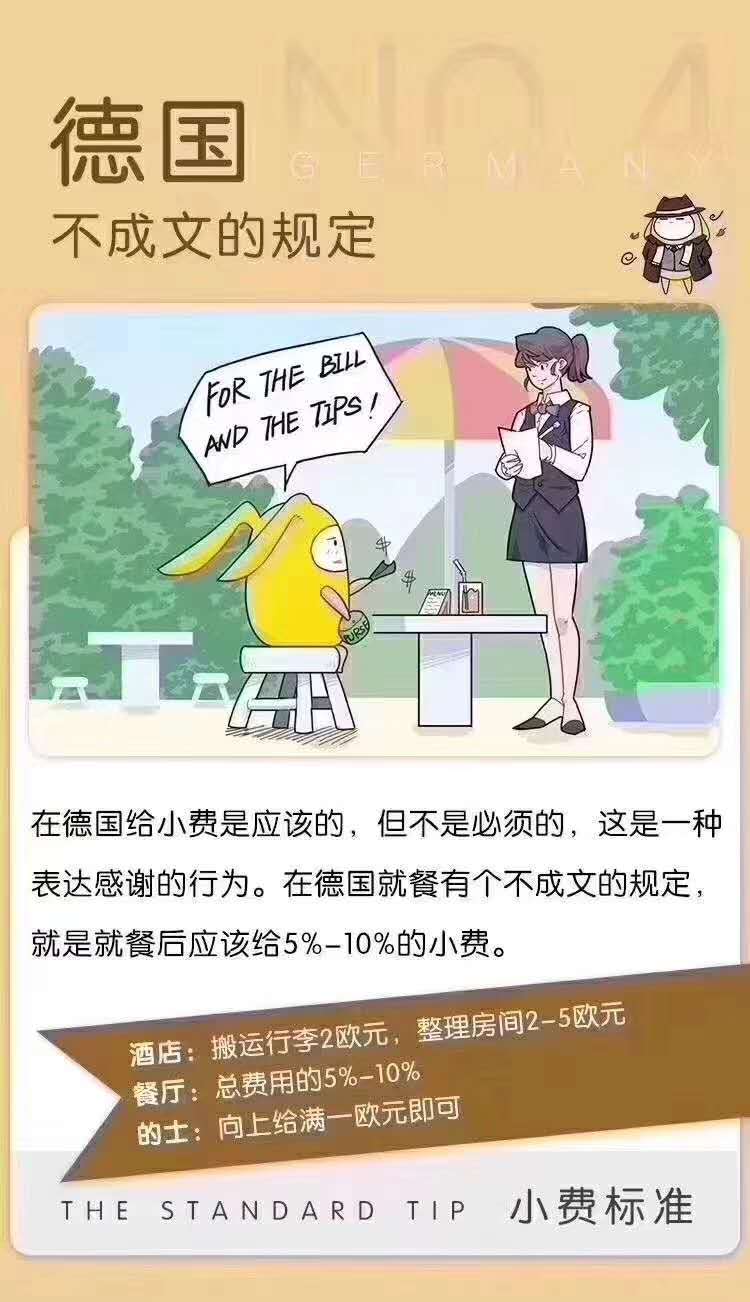 餐館:點(diǎn)餐餐廳的標準為10%,也可以向上取最近的5歐元的倍數